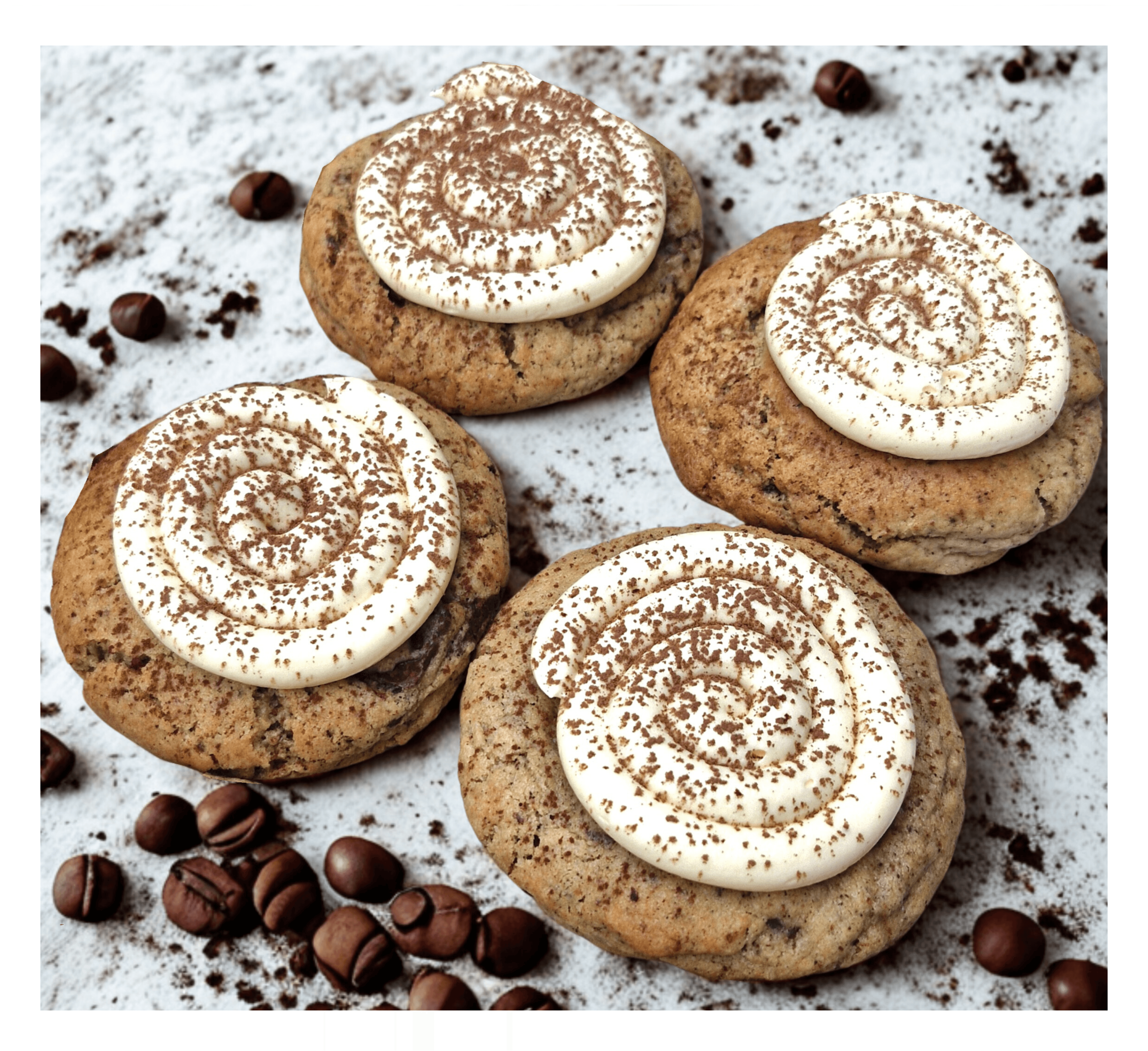 Kickstart your year with a box of tiramisu cookies! This is our cookie flavour for January - 4 cookies made with our delicious espresso brown butter chocolate chip cookie base, and with a mascarpone filling. Treat yourself or a special someone!