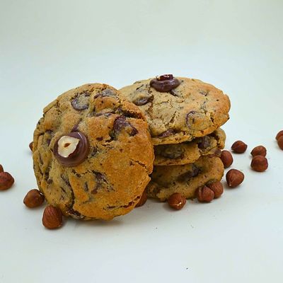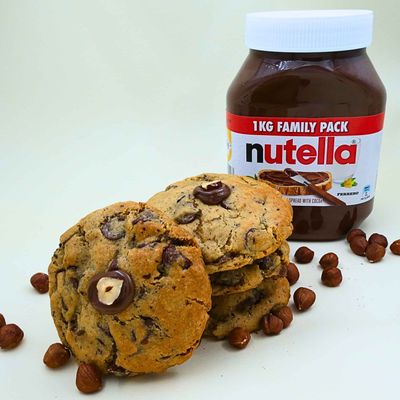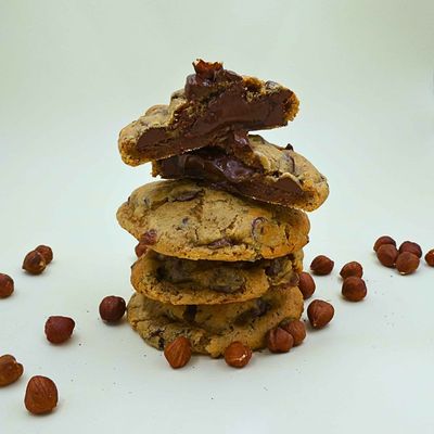 4 chocolate chip cookies, made with our delicious brown butter cookie base, and stuffed with a generous dollop of Nutella. Topped with a bit of Nutella and a hazelnut.