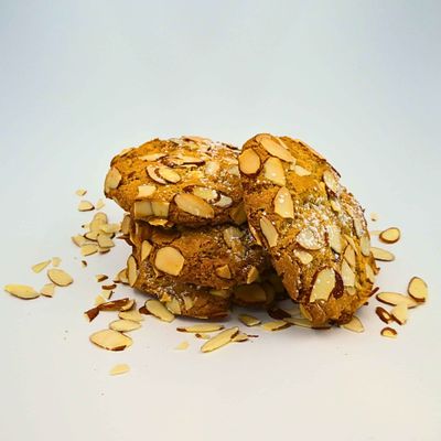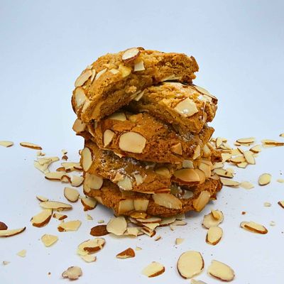 4 cookies made with our delicious brown butter cookie base, with white chocolate chips and chopped Caramilk chocolate, and stuffed with a generous dollop of frangipane - a fragrant almond cream. Rolled in almond shavings.