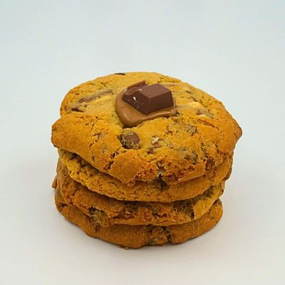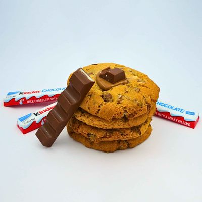 4 cookies made with our delicious brown butter cookie base, with chocolate chips and chopped Kinder chocolate, and stuffed with a generous dollop of hazelnut spread (tastes like the inside of Kinder Bueno).
